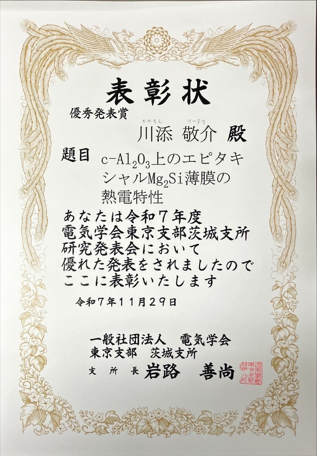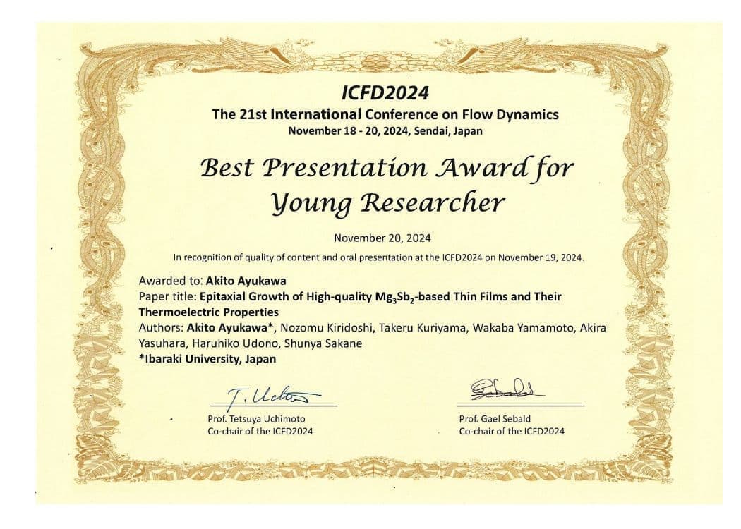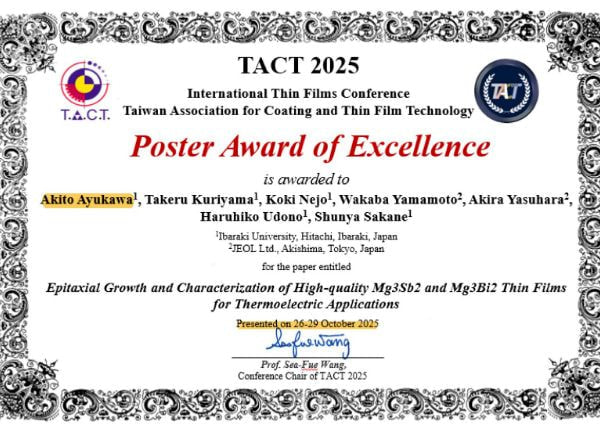 優秀発表賞(ポスター発表部門)"c面サファイア上のエピタキシャルマグネシウムシリサイド薄膜の熱電特性" 川添敬介 令和7年度 第33回 茨城支所 研究発表会 |