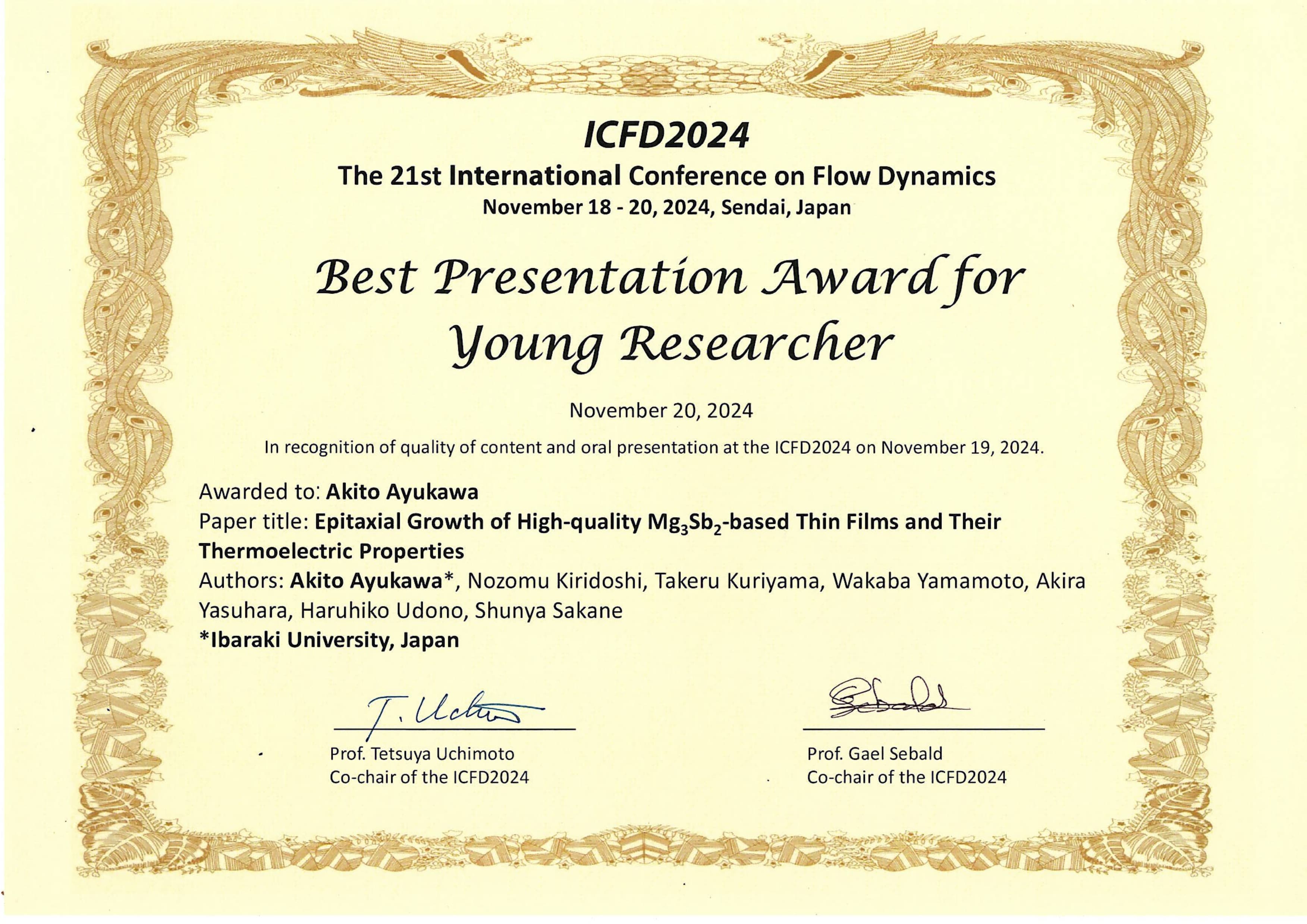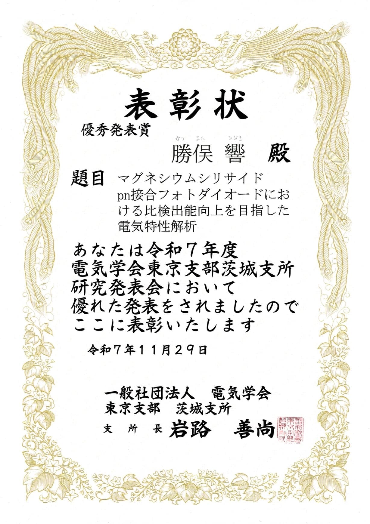 優秀発表賞(口頭発表部門)"マグネシウムシリサイドpn接合フォトダイオードにおける比検出能向上を目指した電気特性解析" 勝俣 響(勝俣 響,古田良輔,関口英紘,長谷川翔吾,清水匠,鉄幸多朗,島野航輔,坂根駿也,鵜殿治彦) 令和7年度 第33回 茨城支所 研究発表会 |