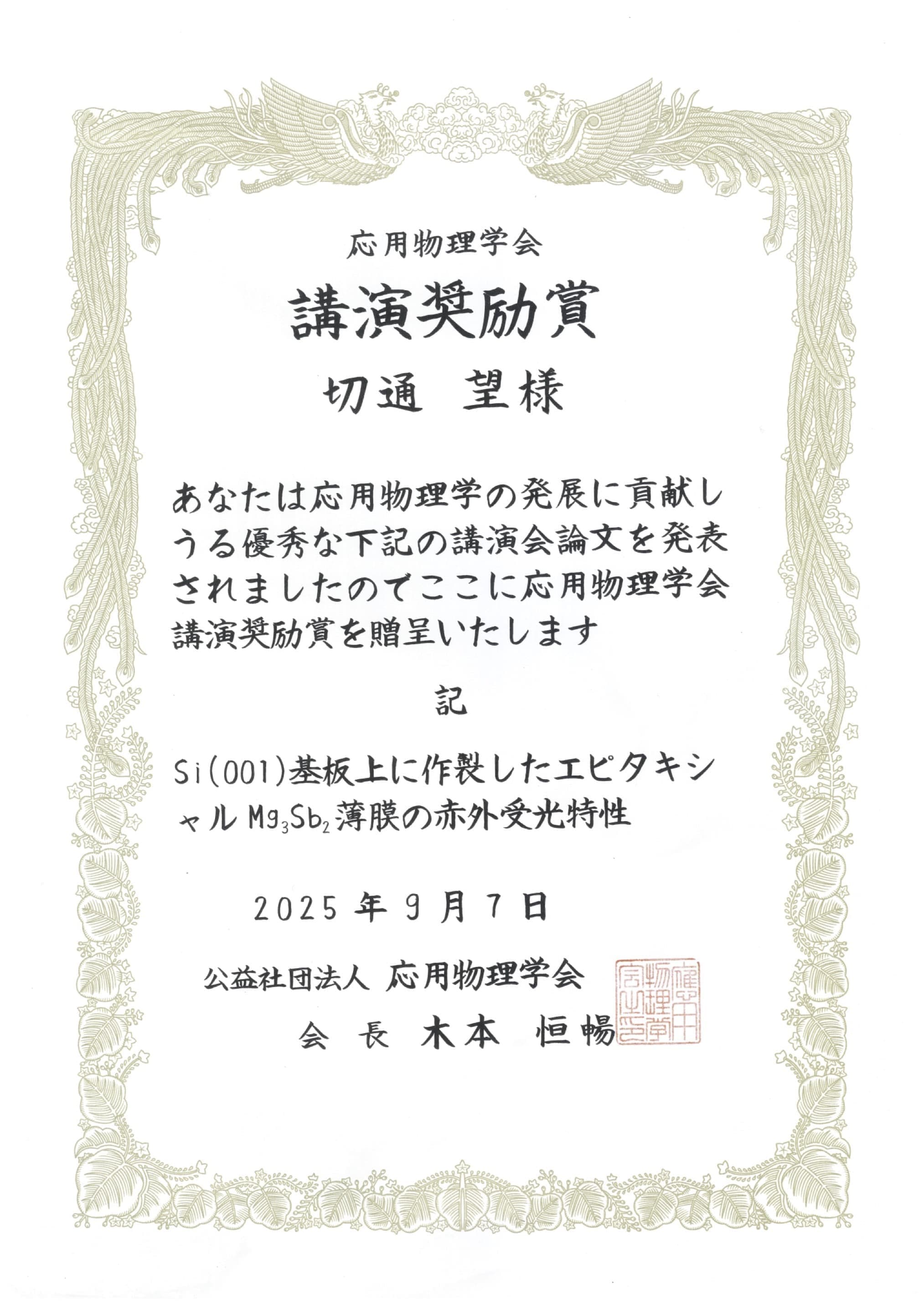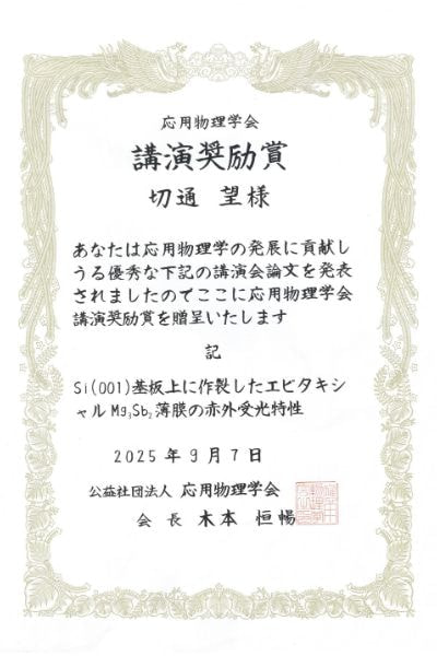 第58回(2025年春季)応用物理学会講演奨励賞 |