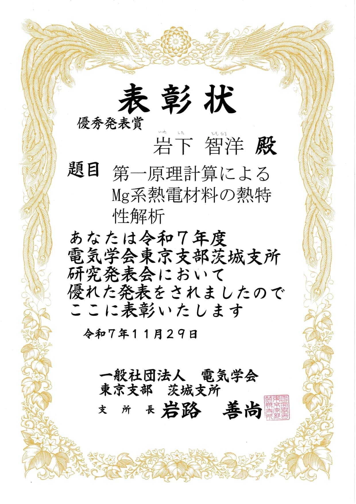 優秀発表賞(ポスター発表部門)"第一原理計算によるMg系熱電材料の熱特性解析" 岩下智洋(岩下智洋,鮎川瞭仁,切通望,鵜殿治彦,坂根駿也) 令和7年度 第33回 茨城支所 研究発表会 |